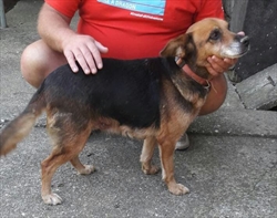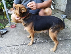 Dolutala draga i umiljata kujica, na prvu malo plaha. Na sebi ima crvenu ogrlicu.
