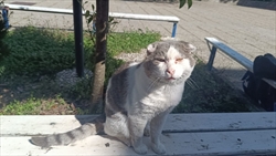 Danima boravi mačka ispred škole u Botincu. Djeca joj kupuju hranu. Sivo bijela, skotski fold vrsta kaze google. Nije neuhranjena, ali loših ociju.