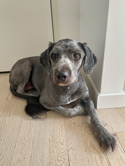Izuzetno plaha, srednjeg veceg rasta, sive boje, sol i papar, osisana na kratko, ima 4 godine i ne odaziva se niti na jedno ime, niti zna komande.
