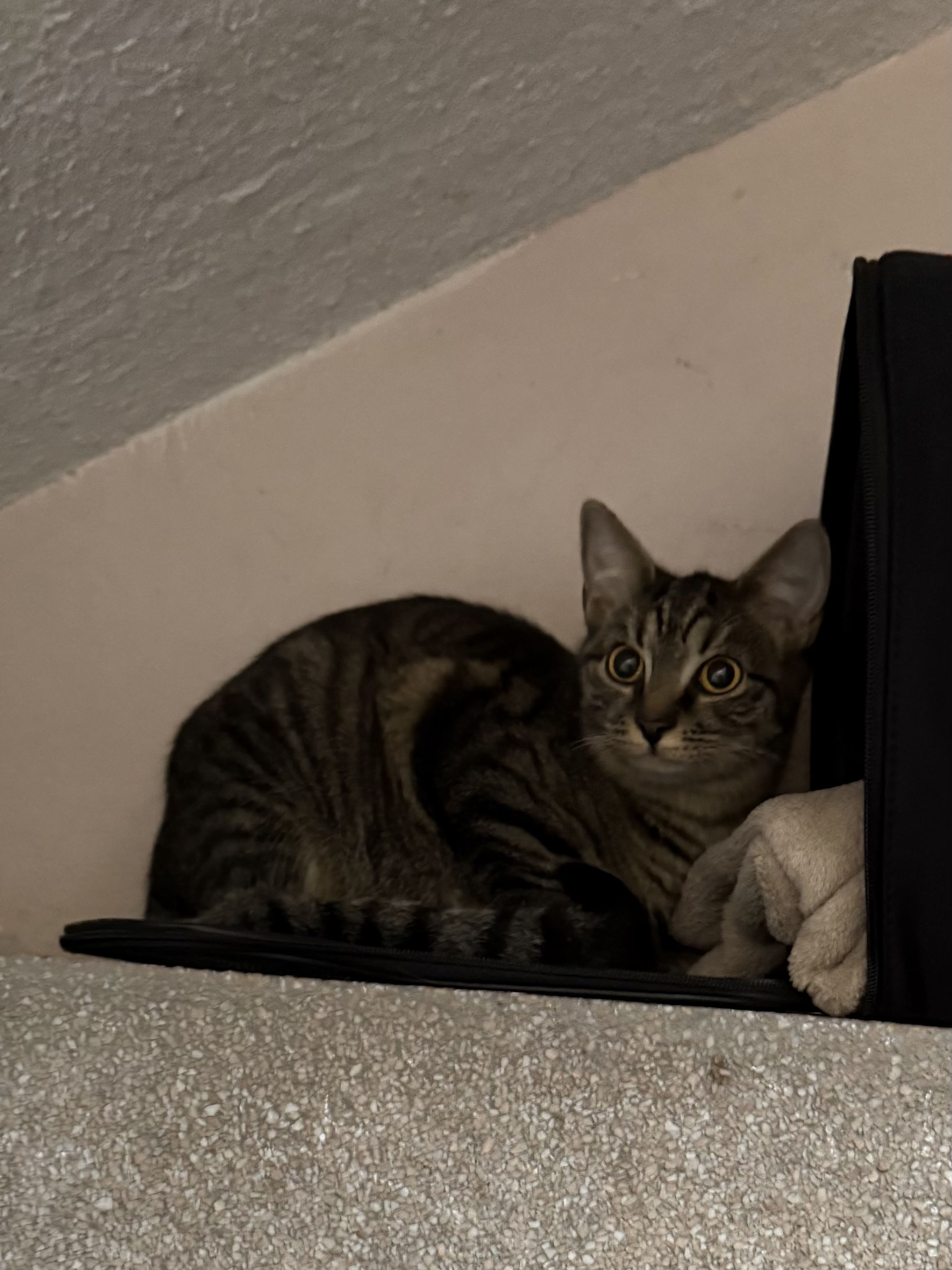 Macka je jako umiljata. Po svemu sudeci ne luta dugo— cista i uredna. Crna na ledima. Utrcala je u haustor zgrade trazeci zaklon, zbog cega smo dosli do zakljucka da je mozda cak i bila kucna macka.