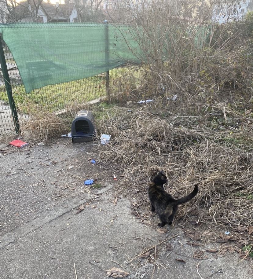 Maca izgleda kao da živi tu na ulici, ima kučicu napravljenu od wc, ali ne koristi je jer inutar sve je davno mokro i usmrdjelo. Okolo ima starih zdjela s ostacima stare hrane. Maca pri tom izgleda dobro i uhranjeno, tako da nadam se da ipak ima negde blizu pravi dom i vlasnika, koji nadam se da će se javiti.