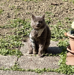 Sivi dugodlaki mačak, Ima zavoj plavi vojnički oko vrata i prednje cijele šape, vuče nogu po podu, čeljust nije funkcionalna i otvorena su mu usta. Odaziva se na ime Lugo. Nestao na području Folnegovićevog naselja i Borovja.