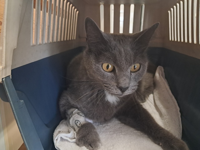Kratkodlaka siva mačka zelenih očiju. Ranjena na području Novog Zagreba.