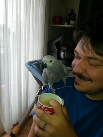 Sive je boje i ima crveni rep. Pitom je i ide na ruku. Obožava kikiriki, odaziva se na ime Koko. Smo trebate podići ruku i pozvati ga Koko dođi.