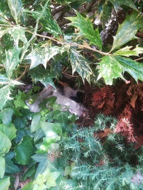 Maca se omacila u grmu pored ulaznih vrata nalaznice. Taj grm nije nikakvo sklonište ni od sunca, a kamoli kiše. Potrebna je pomoć tj smještaj