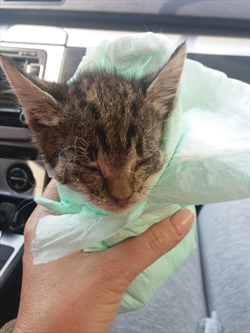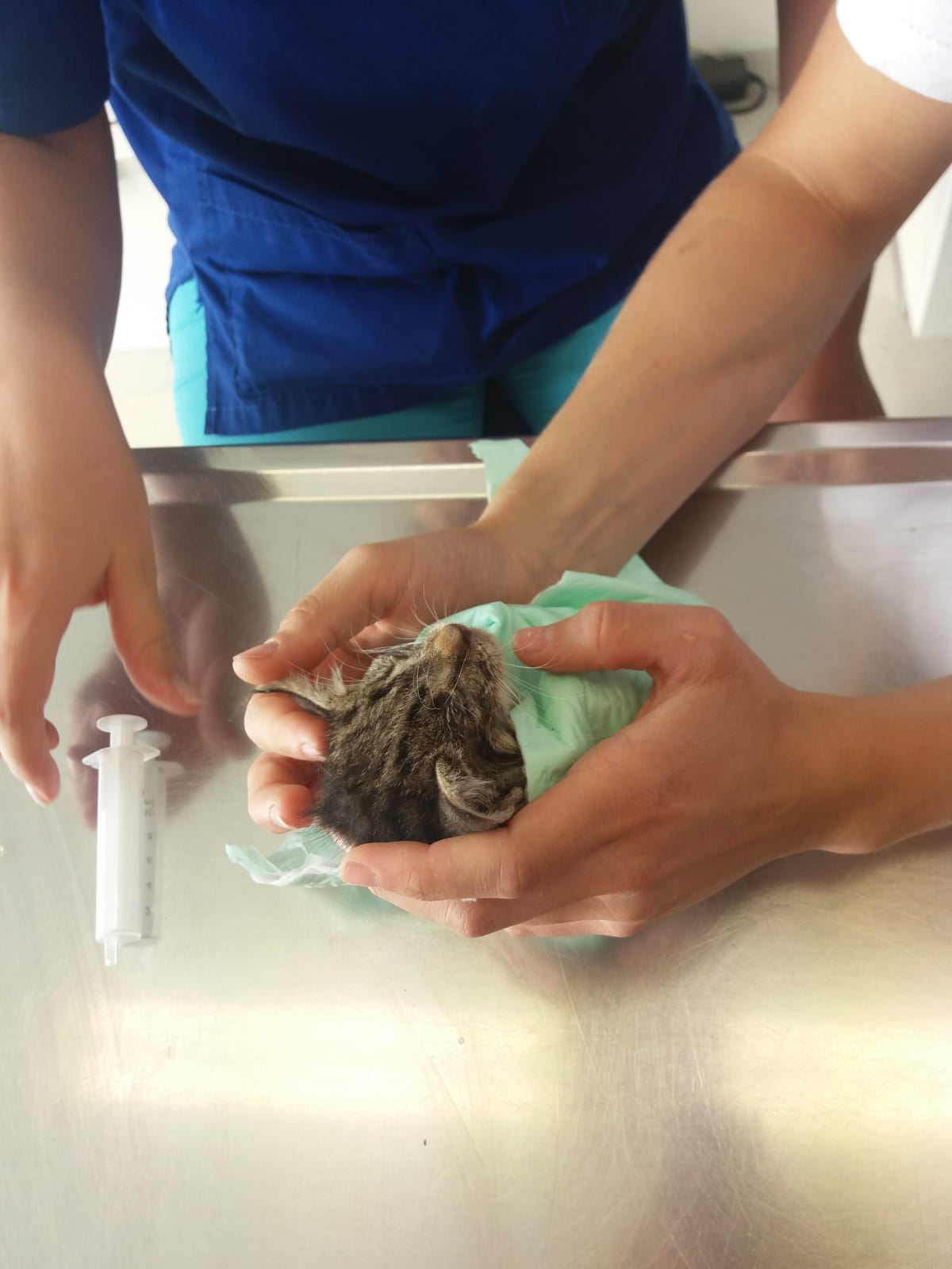 Malena se zove Mrvica. Našli smo je jučer u Gavazzijevoj na cesti iza parkiranog auta. Nismo imali srca da je ostavimo tako malenu. Mislili smo da je slijepa pošto su joj okice bile zatvorene. Veterinar ju je pogledao, očistio joj oke i nos od gnoja, očistio nju i cijepio je. Drugu dozu, pošto je slaba treba primiti u ponedeljak. Doveli smo je u posljednji čas, ako preživi vikend - poživjet će. Neću Vas lagati: dehidrirana je - treba je pojiti što češće, hraniti što češće na špricu(posljednji put sam ustajala tokom noći hraniti nekoga - kada su moji klinci bili bebe) , čistim joj okice dva puta dnevno fiziološkom, dajem antibiotik isto dva puta dnevno.
