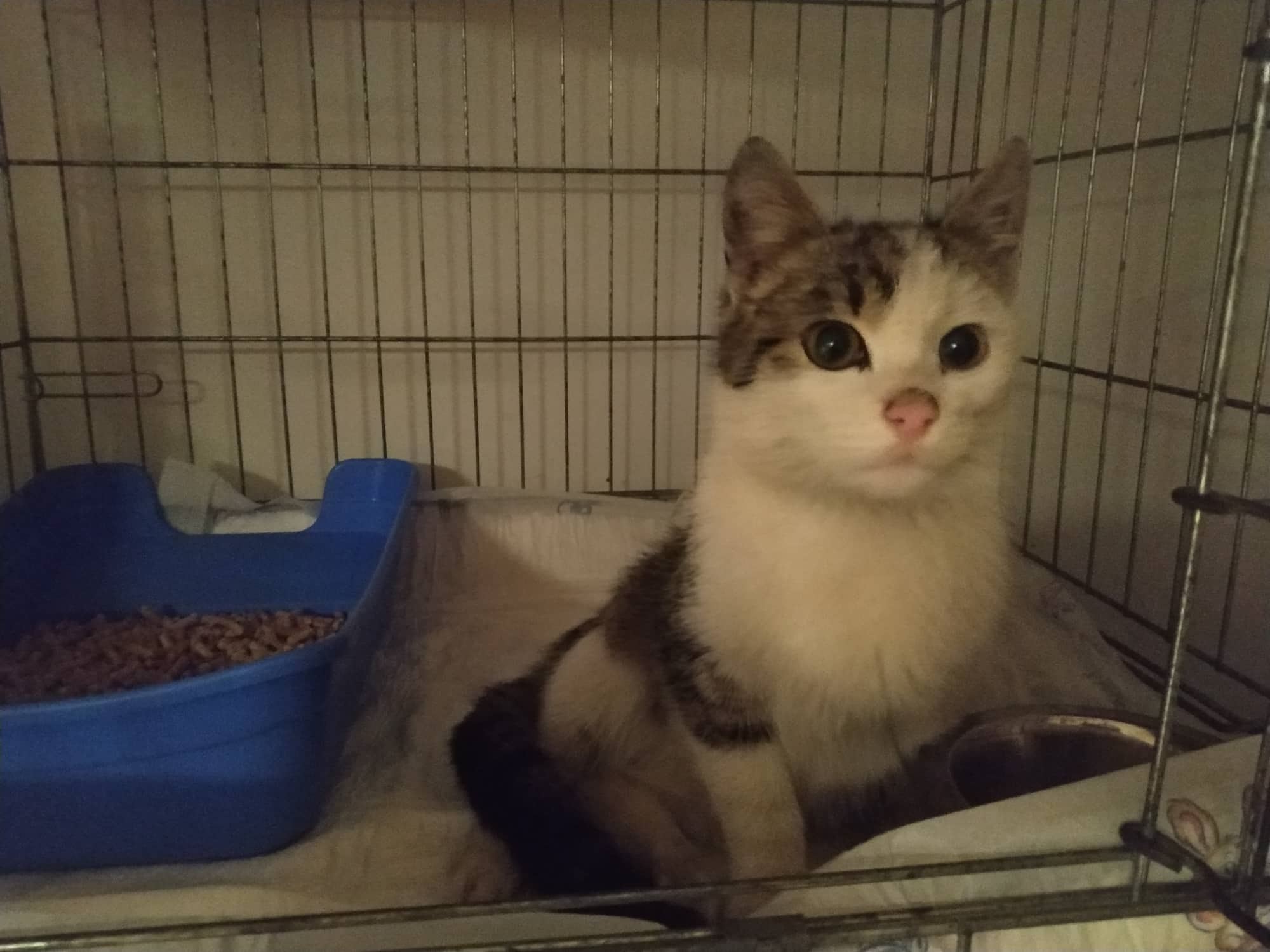 Pronađen je pitomi bijelo tigrasti mačić, mužjak, star oko 5 mjeseci . Ima povrijeđenu zadnju lijevu šapu i slomljenu zdjelicu