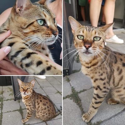 Bengalski mačak nađen na ulici Svete Klare u Zagrebu.. na ulici je već mjesec i pol dana, ljudi su ga hanili. Ja sam jučer otišla po njega i sklonila ga sa ulice. Odvela sam ga veterinaru na očitanje čipa ali nije čipiran. Mačak je kastriran. Traži se vlasnik, ako se ne nađe da se može sigurno udomiti.