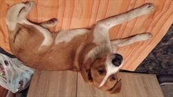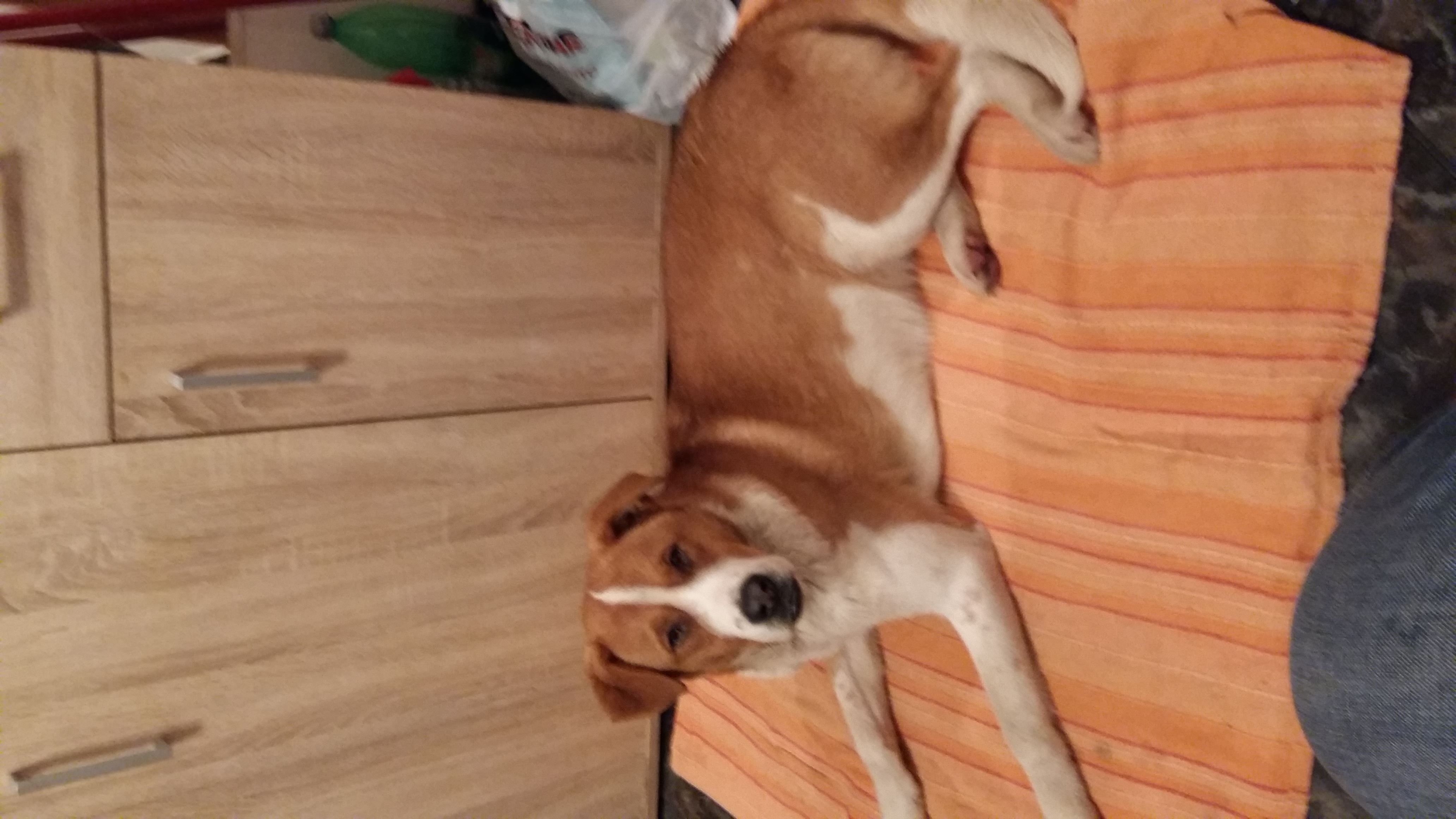 Mlad, muški pas, veličine njemačkog ovčata starosti oko godinu dana, žuto bijele boje.