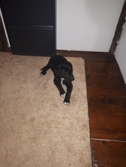 Crna, vrhovi šapa i vrh repa bijeli, ispod vrata prema prsima bijelo u obliku zvijezde.