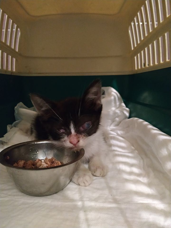 Pronađeno slijepo mače. Privremeno smještena. Trenutno na terapiji da bi se vidjelo ima li nade za desno oko.