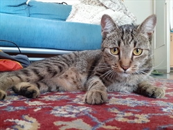 Sivi tigirć, velikih žutih očiju. Očito je kućni mačak koji je nekome odlunjao.