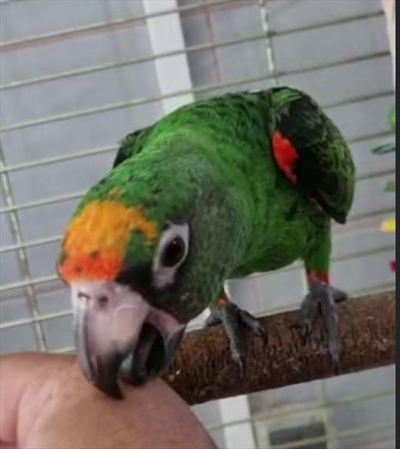 Ženka Jardine papige, zelene boje s crveno narančastim perjem na glavi, ramenima i nogama. Odletila je ujutro 3.1.2022. Zove se Mookie, govori rijeci na engleskom.