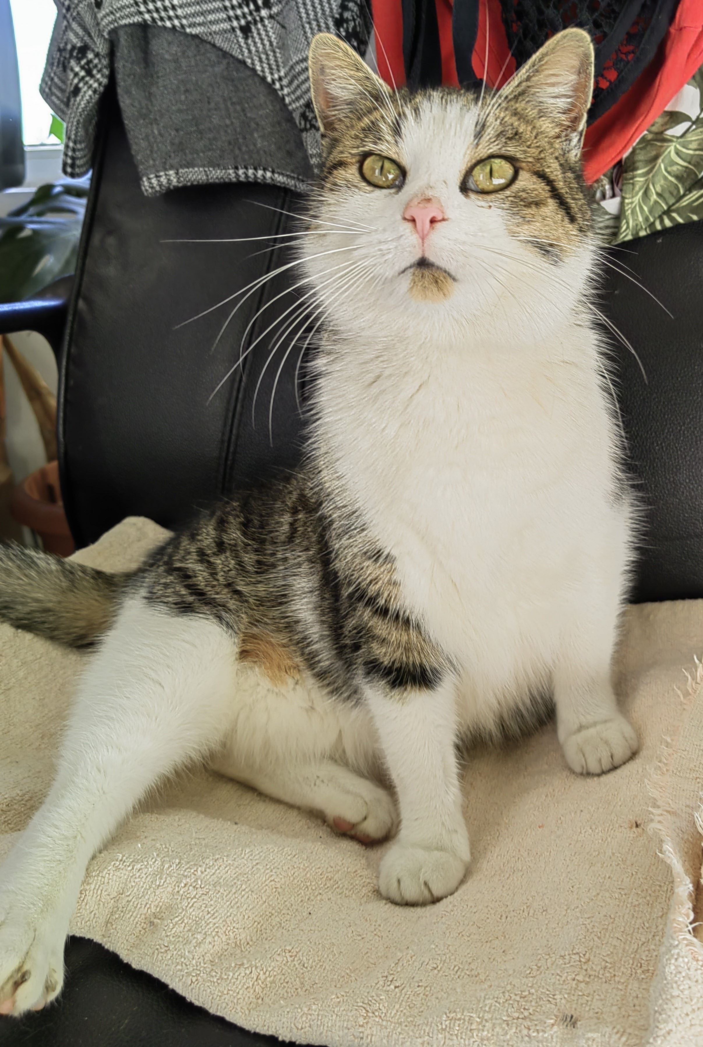 Umiljata ženska mačka, igra se i skoči ti u krilo. Ima crnu usnu i flekicu na bradi.