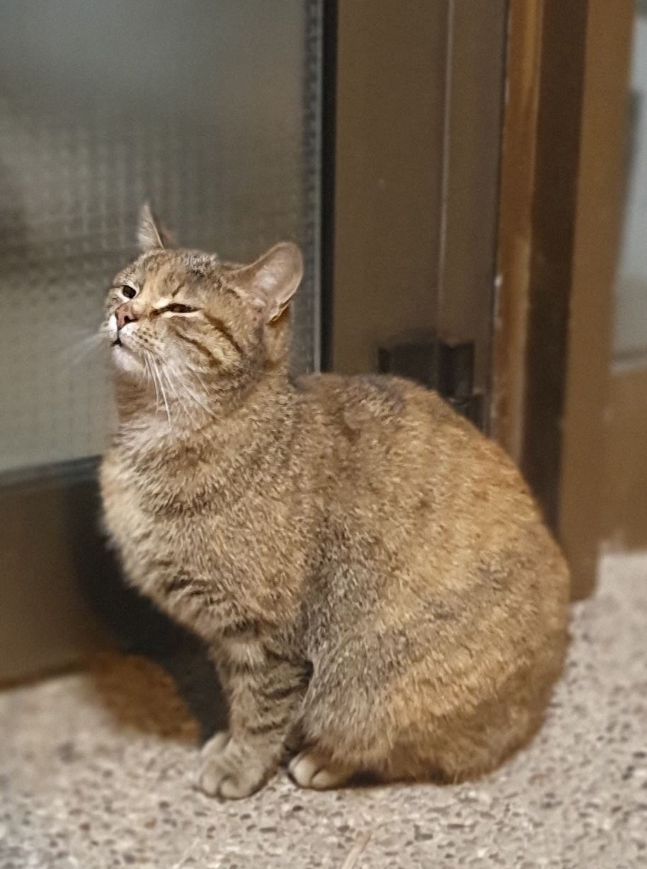Mlada mačka, poluduge dlake, smeđe šatirana, umiljata, očito naučena na ljude, čekala je strpljivo pred vratima zgrade 28. 3