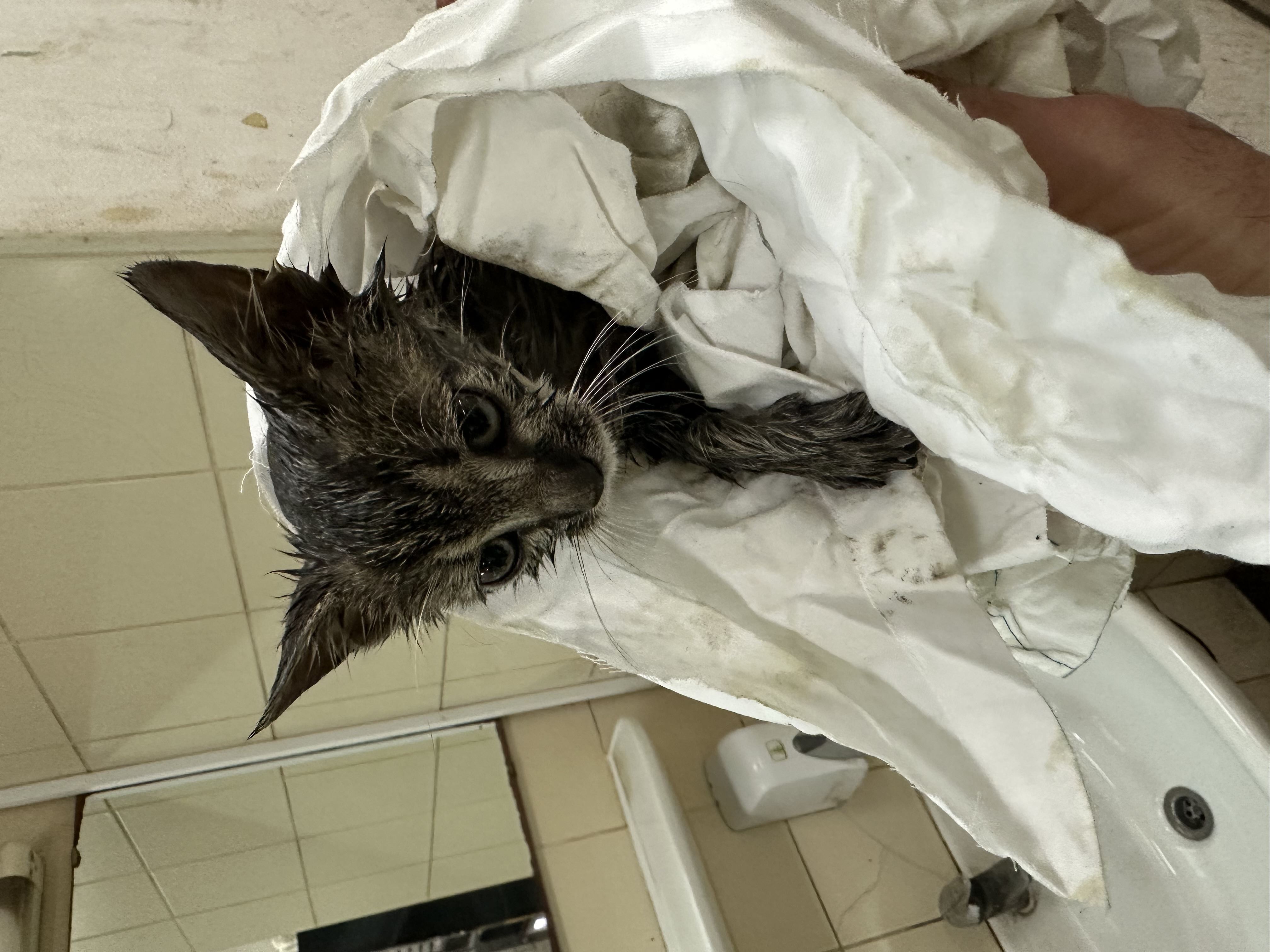 Postovani danas smo nakon 3 sata pokusavanja spasili ovu macu ispod stroja u pogonu Gredelja, masna je cjela od ulja oprali smo je malo, i nahranili, ima oko mjesec dana prestrasena beba.