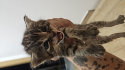 Info centar - detalji pronađene životinje Vrsta Mačka Spol N Boja dvobojna Dlaka kratka Datum prijave 20.8.2025. Područje Planina Donja Identifikator 70608 Opis Ostavljen na cesti u vreči. Starost 2 tjedna,bolestan. Podijeli na Facebooku Galerija slika natrag