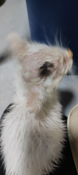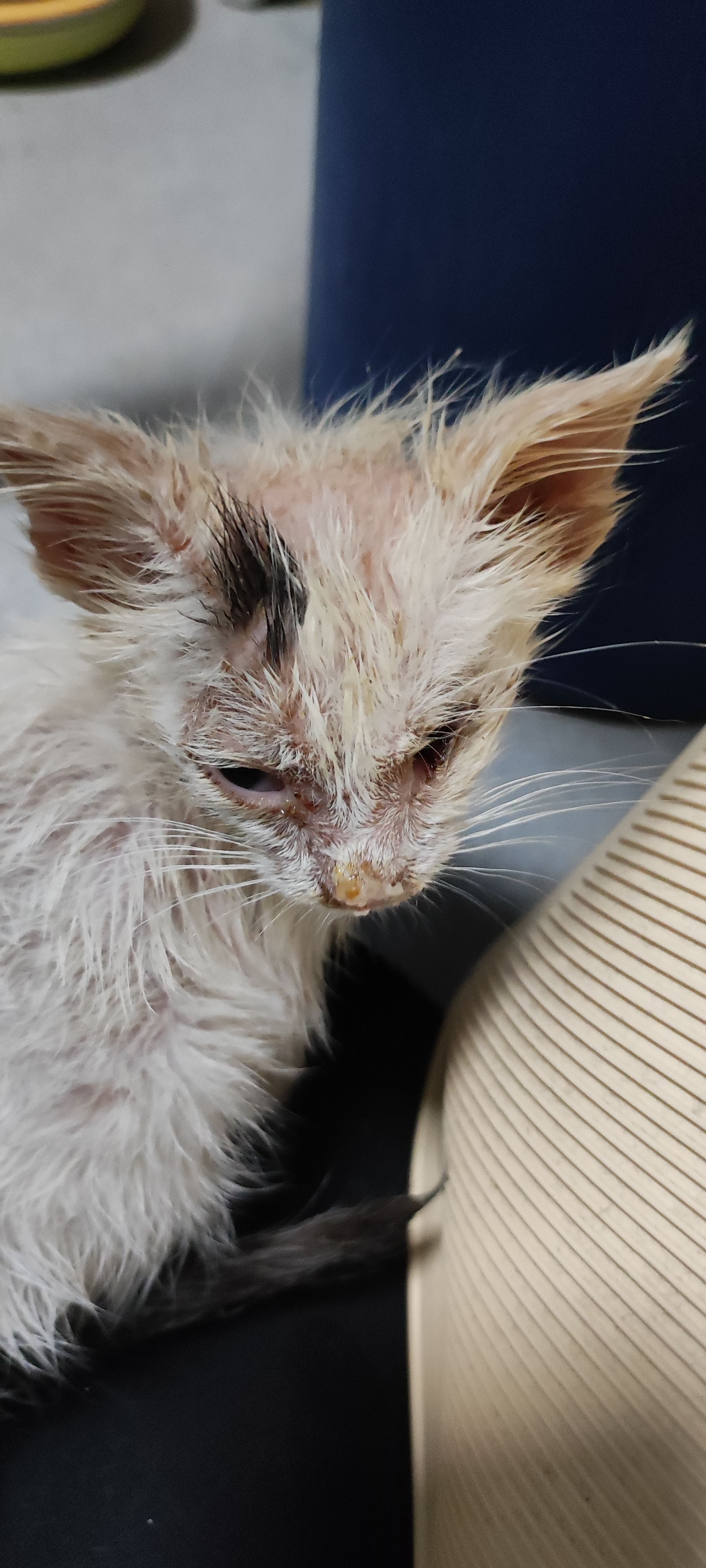 Maca je nađena 5.9 u polumrtvom stanju. Odvela sam ju u najbližu veterinu jer nisam imala prijevoz ,dali su Canesten i tobrex. Mažem i kapam. Počela je dlaka otpadati.