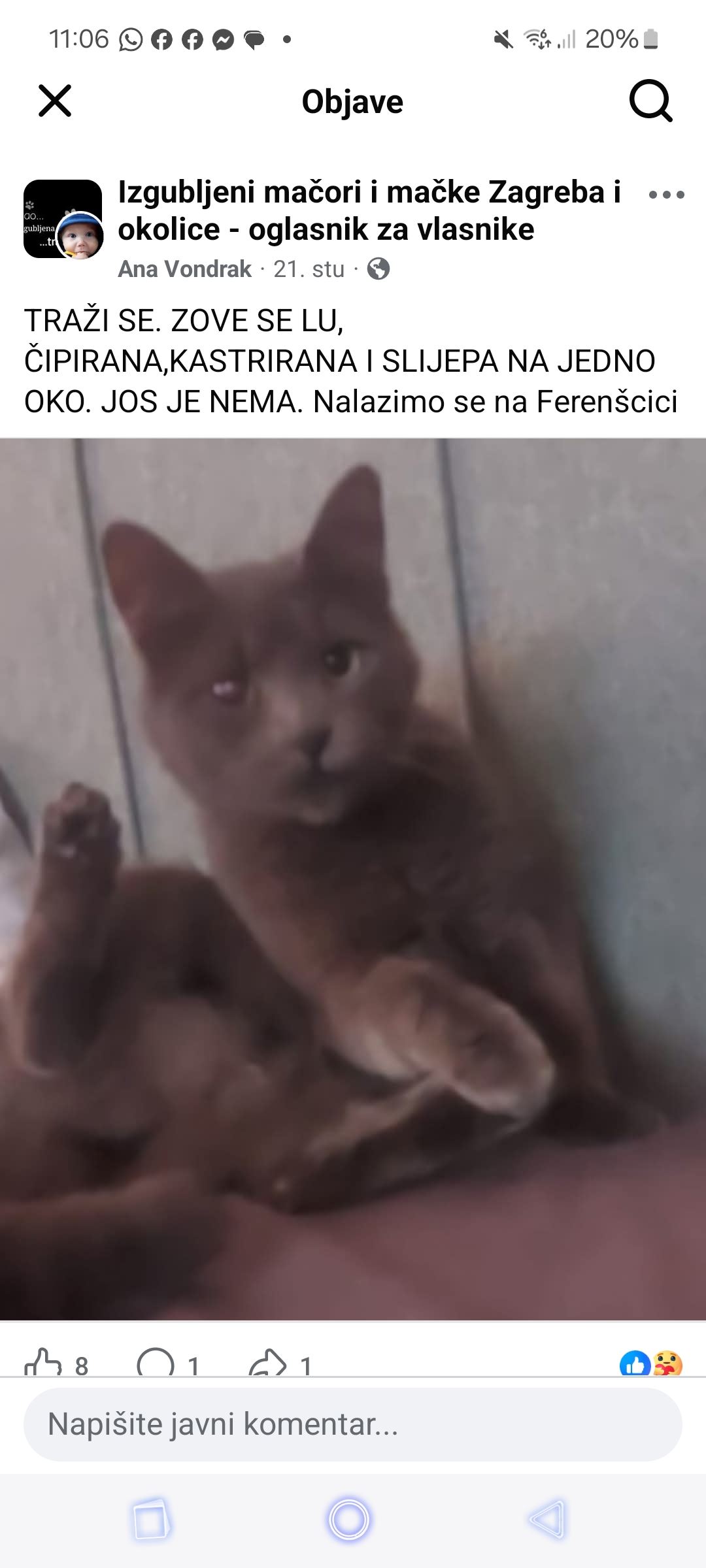 Maca Lu ima desno oko mutno. Voli se maziti i prilaziti ljudima.
