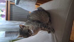 Ivađen iz potoka sa još jednim mačićem koji je uginuo (bili u vrećici sa ciglom). Još su imali pupčanu vrpcu. Mika je imao 80 gr. Sin ga je uspio othraniti na dudu i donio ga nama u Gradec.. Sada je oko 3 kg. Mislimo da je bolje kastrirati kako se nebi tukao sa dr.mačkima.