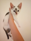 Mačak je bio kod veterinara - ima točno 1 kg. Zdrav je. Nema nikakvih vanjskih nametnika (poput mačje šuge, buha).. Jako je pitom i mazan iako s nama ima prvi kontakt s ljudima. Na prvu je malo oprezan, ali ubrzo krene presti i maziti se. Jede sve - suhu hranu, mokru hranu. U jednom danu naučio koristiti pijesak, odnosno mačji WC.